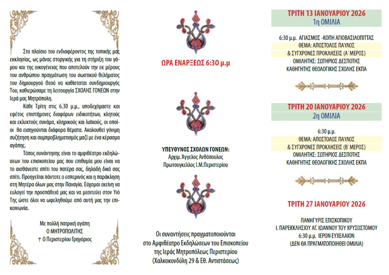 Στο πλαίσιο του ενδιαφέροντος της τοπικής μας εκκλησίας, ως μάνας στοργικής για τη στήριξη του γάμου και της οικογένειας που αποτελούν την εκ μέρους του ανθρώπου πραγμάτωση του σωστικού θελήματος του δημιουργού Θεού να καθίσταται συνδημιουργός Του, καθιερώσαμε τη λειτουργία ΣΧΟΛΗΣ ΓΟΝΕΩΝ στην Ιερά μας Μητρόπολη.
