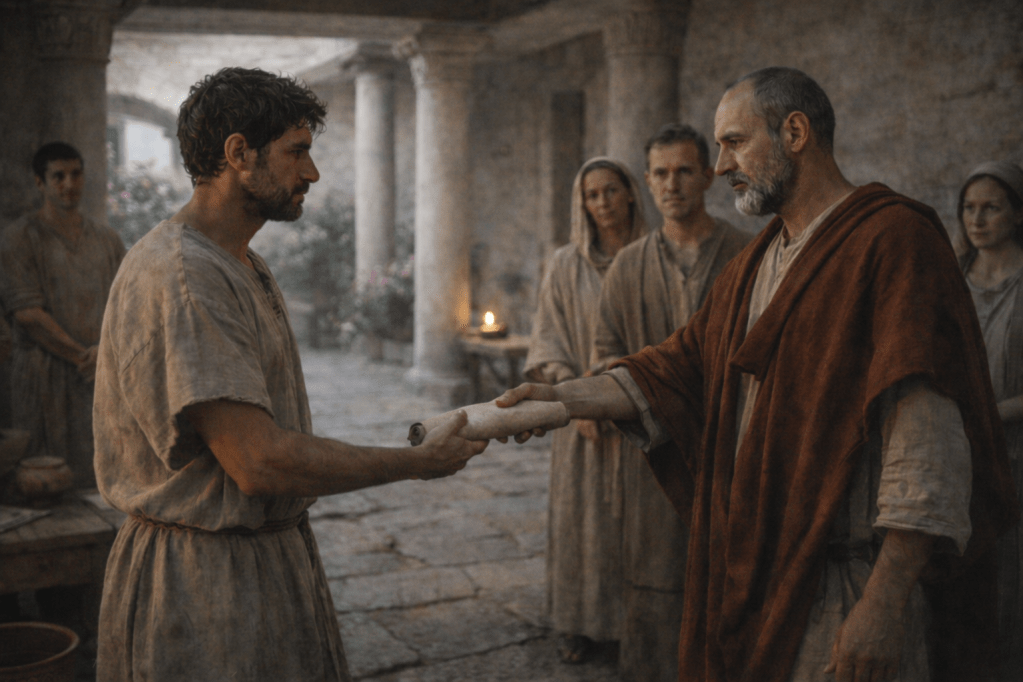 [4] Βλ. P.Lampe, Keine Sklavenflucht des Onesimus, ZNW 76 (1985) 135-7. J.D.G. Dunn Beginnings from Jerusalem, Michigan Eedermans 2009, 1030. Ο Scott S. Elliott, Thanks, but no Thanks’: Tact, Persuasion, and the Negotiation of Power in Paul’s Letter to Philemon, New Testament Studies 57 (2011) 51-64 θεωρεί ότι ο Φιλήμων, αποστέλλοντας τον Ονήσιμο ως δώρο για να εξυπηρετεί τον Π. όσο αυτός ήταν στη φυλακή, θέλει να γίνει πάτρωνας του Αποστόλου των Εθνών. Ο τελευταίος αρνείται ευγενικά κάτι τέτοιο διότι δεν ήθελε εξαρτήσεις. Στην υποσ. 2 του παρόντος άρθρου μπορεί κάποιος να εξετάσει συνοπτικά την ιστορία της έρευνας.